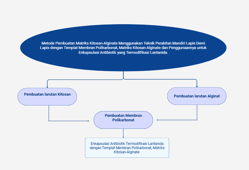 Proses pembuatan matriks dilakukan melalui beberapa tahapan. Pertama, disiapkan larutan polimer berupa kitosan yang dilarutkan dalam campuran NaCl dan asam asetat, serta alginat yang juga dilarutkan dalam larutan NaCl. Selanjutnya, membran polikarbonat berpori disonikasi agar steril dan dapat digunakan sebagai templat. Proses perakitan dilakukan dengan merendam membran secara bergantian ke dalam larutan kitosan dan alginat sehingga terbentuk lapisan matriks, yang dapat diulang hingga puluhan kali sesuai kebutuhan. Antibiotik rifampisin kemudian dicampur dengan ion lantanida, seperti Sm³⁺, Eu³⁺, Tb³⁺, atau Dy³⁺, lalu dienkapsulasi ke dalam matriks kitosan-alginat. Hasilnya diuji melalui berbagai karakterisasi seperti SEM, PSA, dan uji disolusi pada kondisi pH lambung maupun usus untuk mengetahui stabilitas serta profil pelepasan obat.