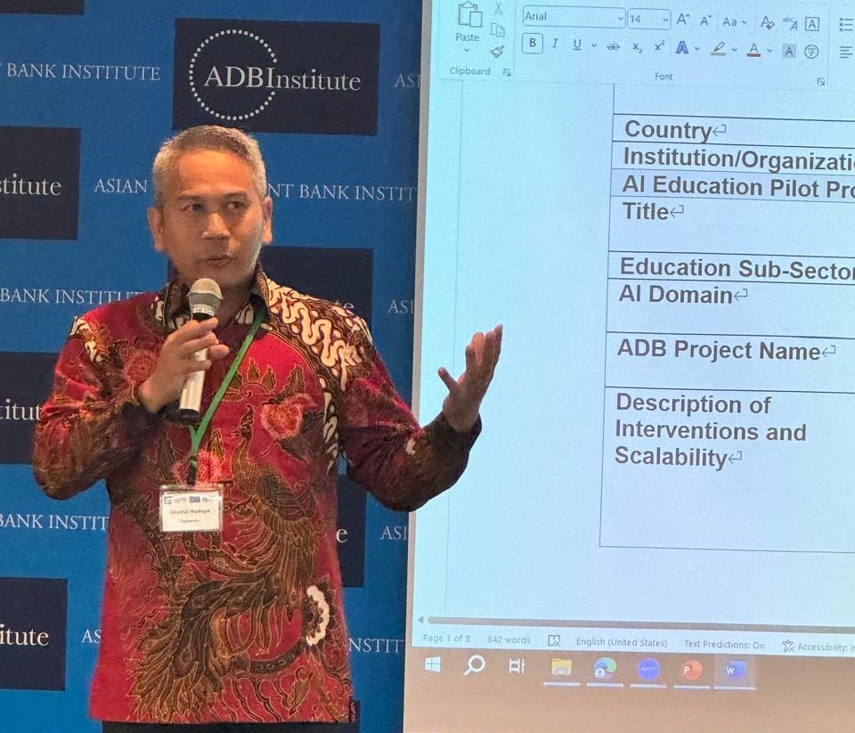 Gambar: Direktur Inovasi dan Riset Berdampak Tinggi Universitas Indonesia, saat menyampaikan pandangan dalam Professional Development Program for AI Application in Education yang diselenggarakan Asian Development Bank Institute (ADBI) di Tokyo, Jepang.